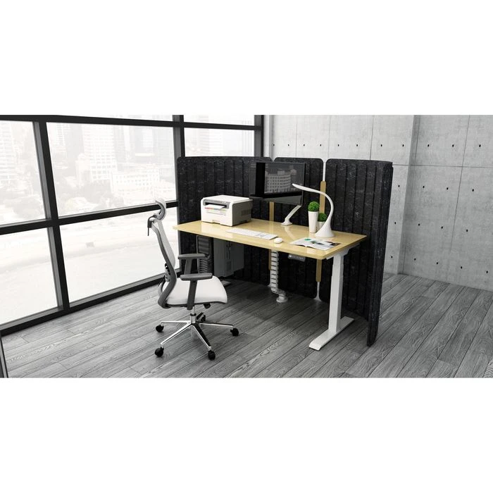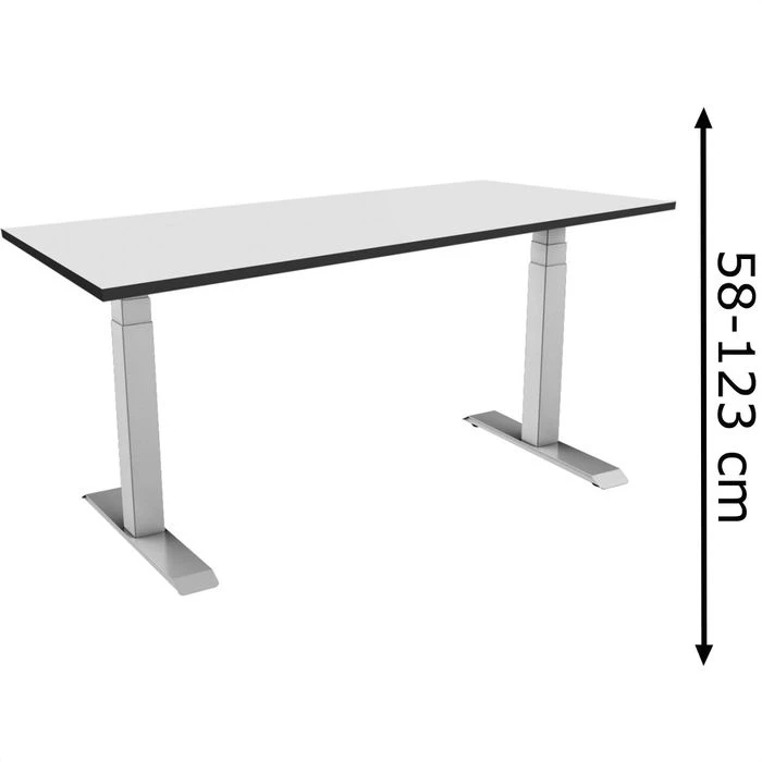 sonstiges: Elektroantrieb, 2 Motoren mit Sanft-Anlauf / Sanft-Stopp, 3-stufig, Hubgeschwindigkeit: 3,8 cm/Sek., Erinnerung an Wechsel der Steh-/Sitz-Position über LED-Anzeige, 3 Speicherplätze zur Höheneinstellung, einstellbarer Kollisionsschutz, digitaler LED-Speicher, Nutzlast 125 kg dynamisch, extrem kratz- und schlagresistent, unempfindlich gegen thermische und chemische Belastungen, Ober- und Unterseite durch jeweils 0,8 mm starke HPL-Beschichtung geschützt, hochfeste Qualitäts-Spankernplatte im Inneren, mit schwarzen ABS-Kanten umleimt, die vor eindringender Feuchtigkeit schützen