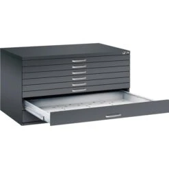 • Niederhalter vorn und Deckleiste hinten verhindern das Aufrollen der Pläne