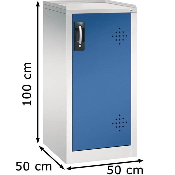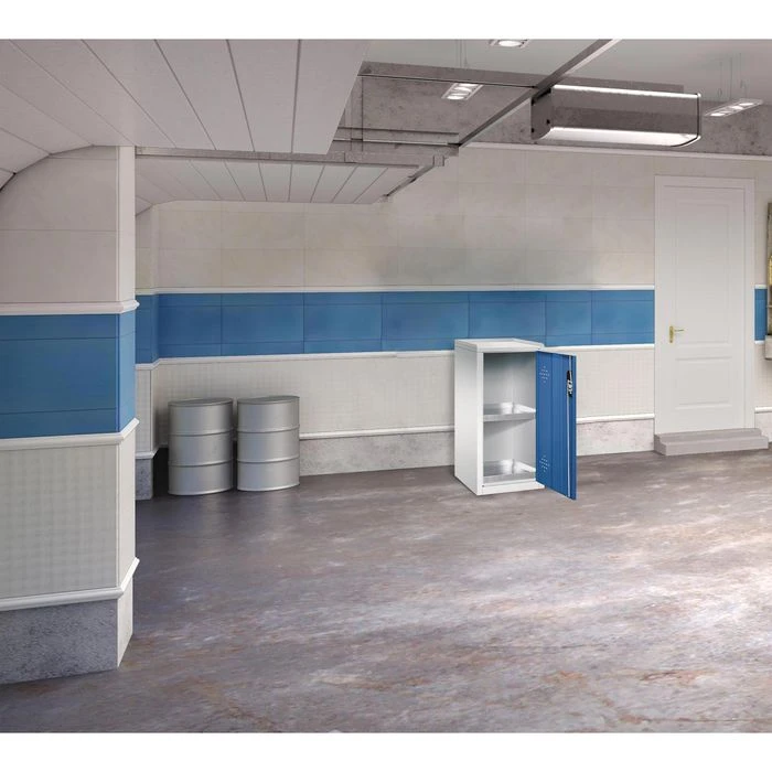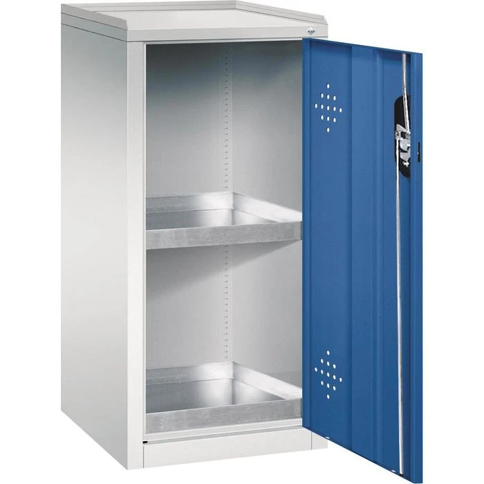 Der Umweltschrank besteht aus massivem Stahlblech mit Einbrennlackierung und abschließbaren Flügeltüren.