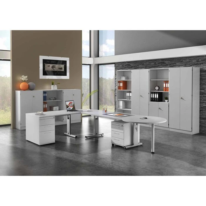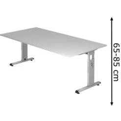 sonstiges: vertikale Kabelführung in Seitenblenden, Höhenverstellung durch Rasterbohrung, strapazierfähige, melaminharzbeschichtete E1-Qualitäts-Spanplatte (nach DIN 68765), hochwertige 2 mm starke und abgerundete ABS-Kanten