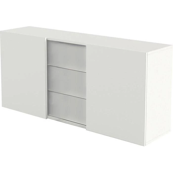 sonstiges: 2 Schiebetüren mit Endarretierung, 3 Schubladen mit 10 kg Traglast, strapazierfähige, melaminharzbeschichtete E1-Qualitäts-Spanplatte, Korpus 19 mm stark, Türen 16 mm stark, Sichtrückwand 3 mm stark, 4 verstellbare Sockelfüße mit Höhenjustierung