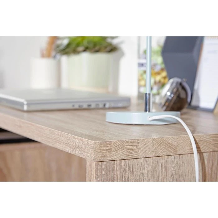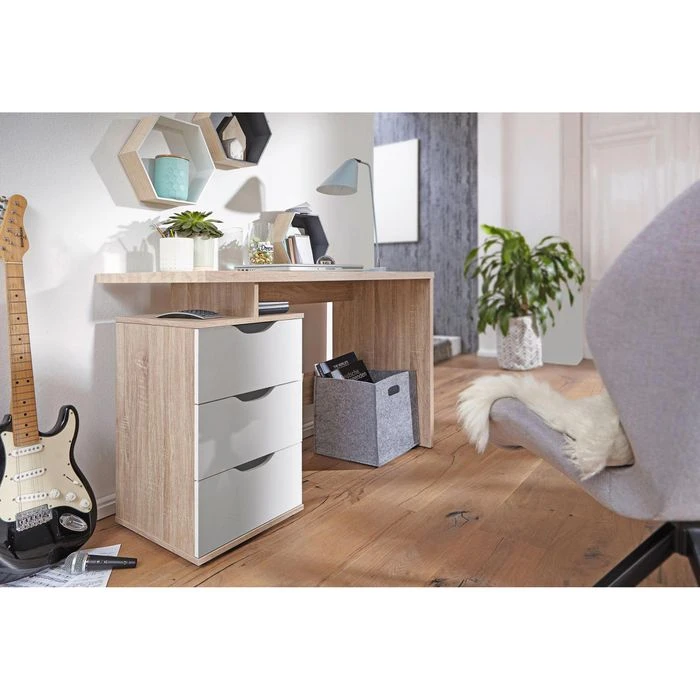 sonstiges: 3 Schubfächer mit Muldengriff, Schubfach mit Metallauszug, zusätzliche Ablage über Schubfächern, strapazierfähige, melaminharzbeschichtete Spanplatte